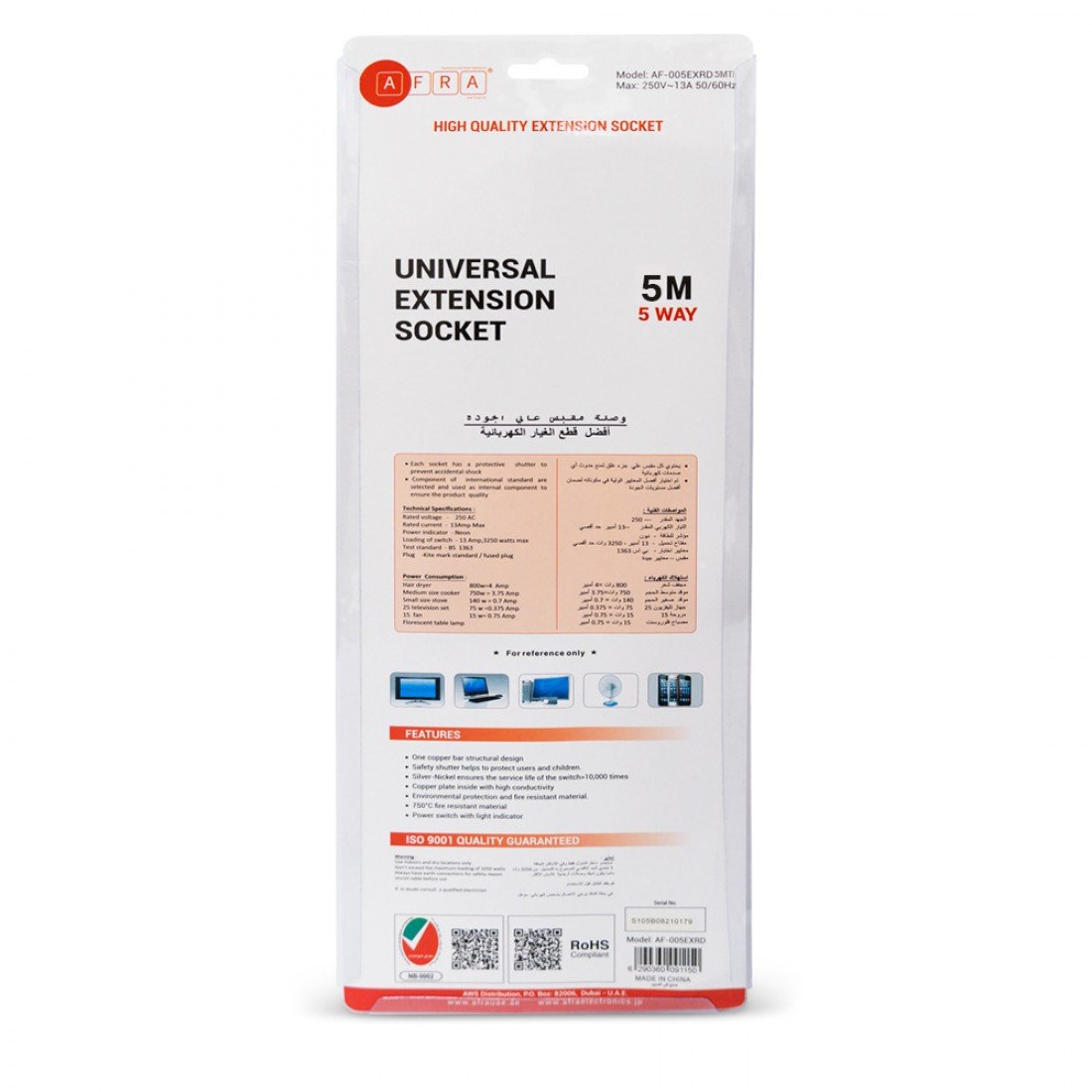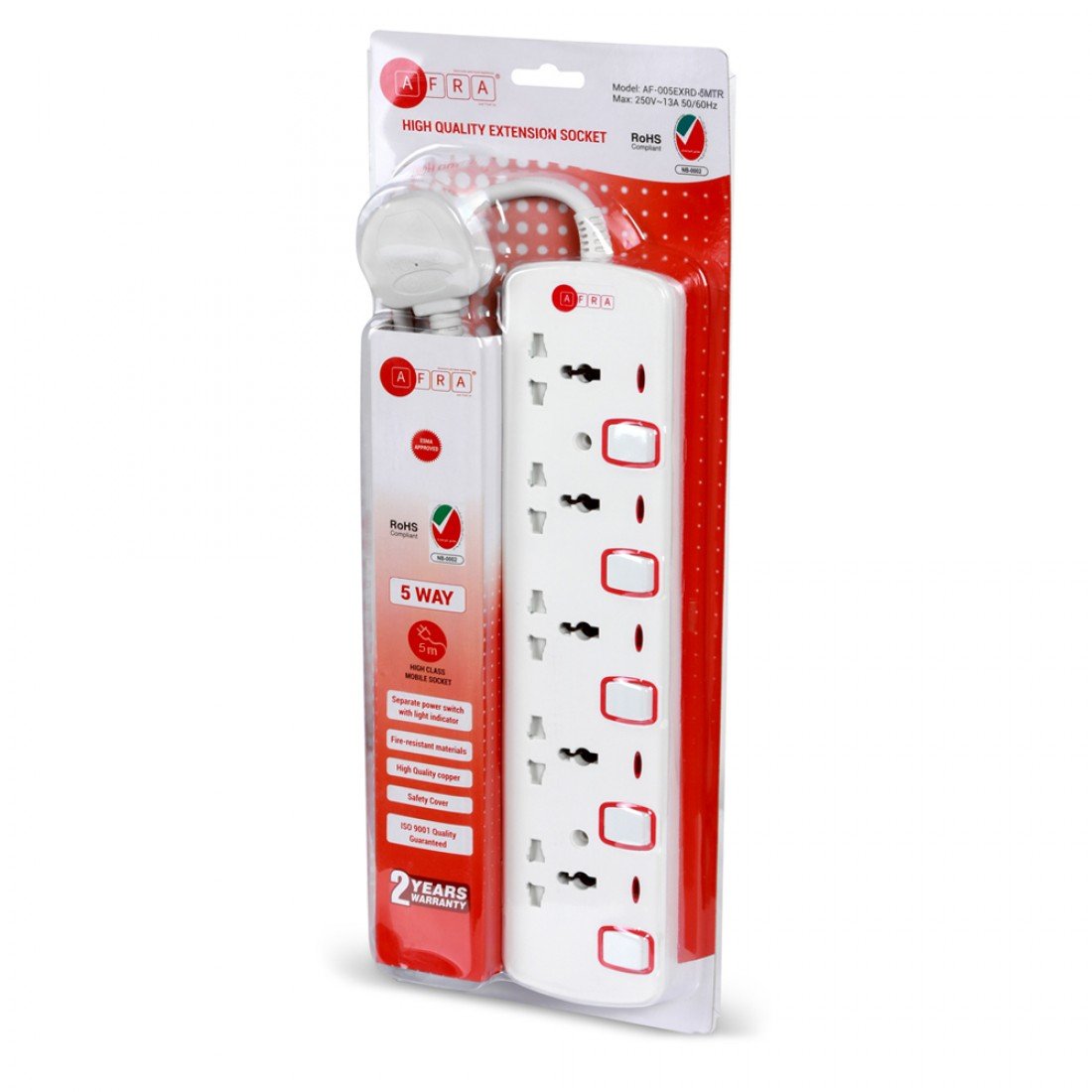 The AFRA Extension Cord AF-005EXRD-5MT is designed for convenience, safety, and versatility. Featuring a 5-meter cable and 5 universal sockets, it easily powers multiple devices simultaneously in homes, offices, or workshops. The shockproof design ensures maximum safety for daily use, while the durable build supports up to 250V. Its compact, easy-to-store design allows hassle-free setup and storage, making it a reliable and practical addition to any space. Covered by a 2-year warranty, it guarantees long-lasting performance and peace of mind.