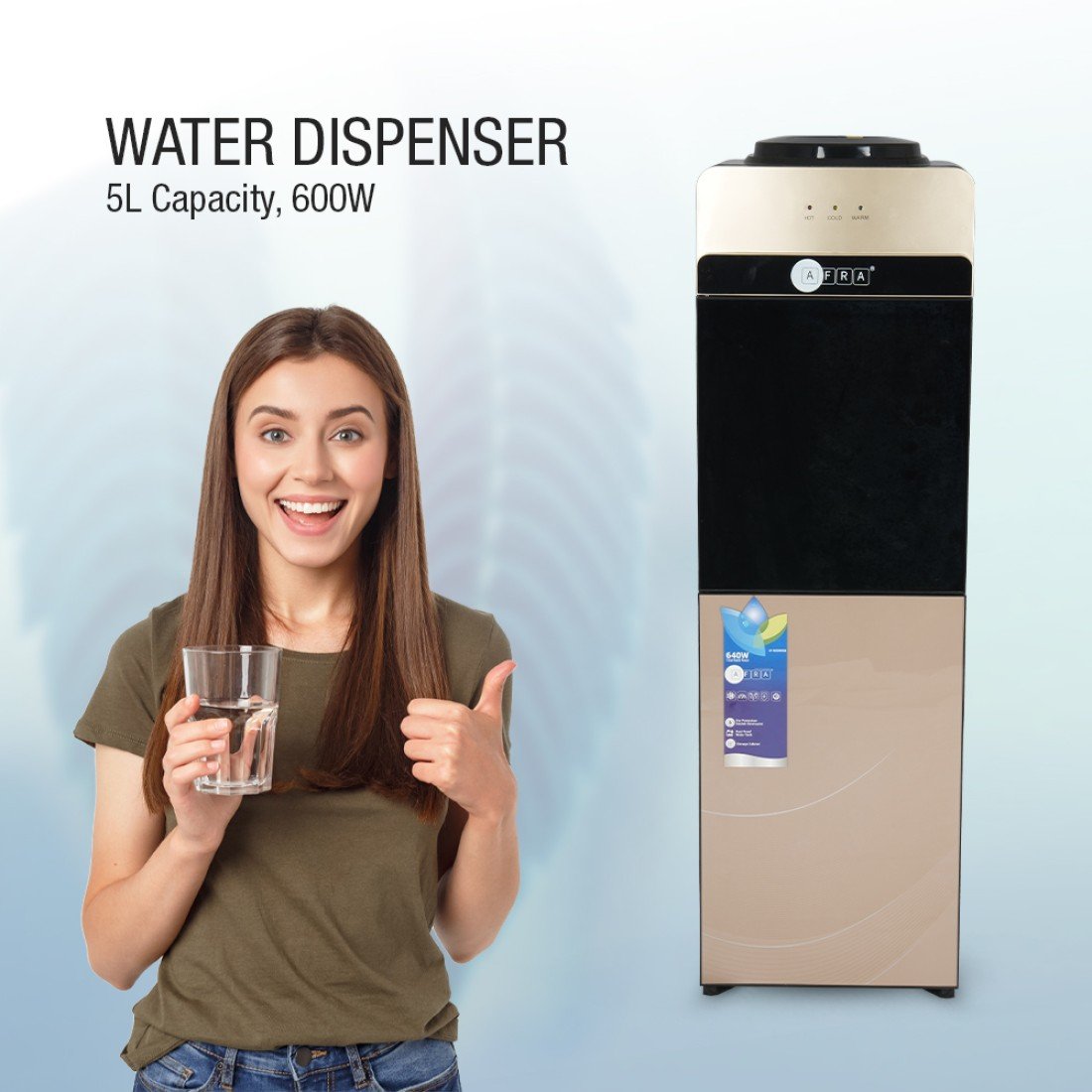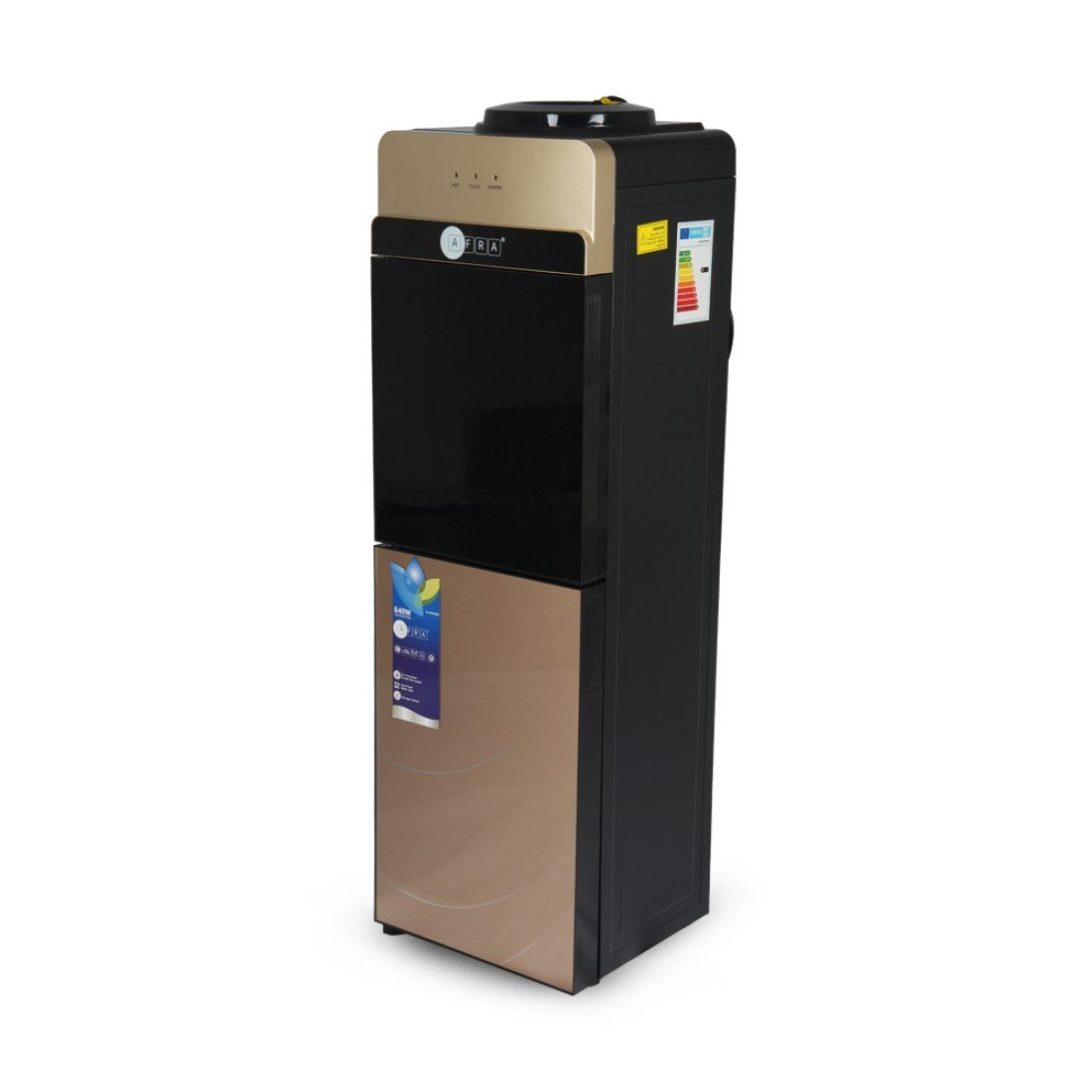 The AFRA Top Loading Water Dispenser (Model AF-9820WDGD) is the ideal solution for convenient, efficient water dispensing in homes or offices. Featuring 550W heating power and 90W cooling power, it delivers 2 liters per hour of cold water, ensuring quick access to hot and cold water at any time. The top-loading design allows for easy water bottle replacement, while the bottom cabinet provides handy storage space. Built for durability and safety, it includes a rust-proof water tank, double thermostat, and dry protection to ensure safe, long-term performance. Backed by a 2-year warranty.