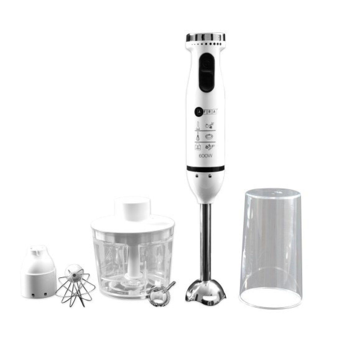 AFRA 5-in-1 hand blender with 600W power, chopper, whisk, mixing cup & 2-year warranty.