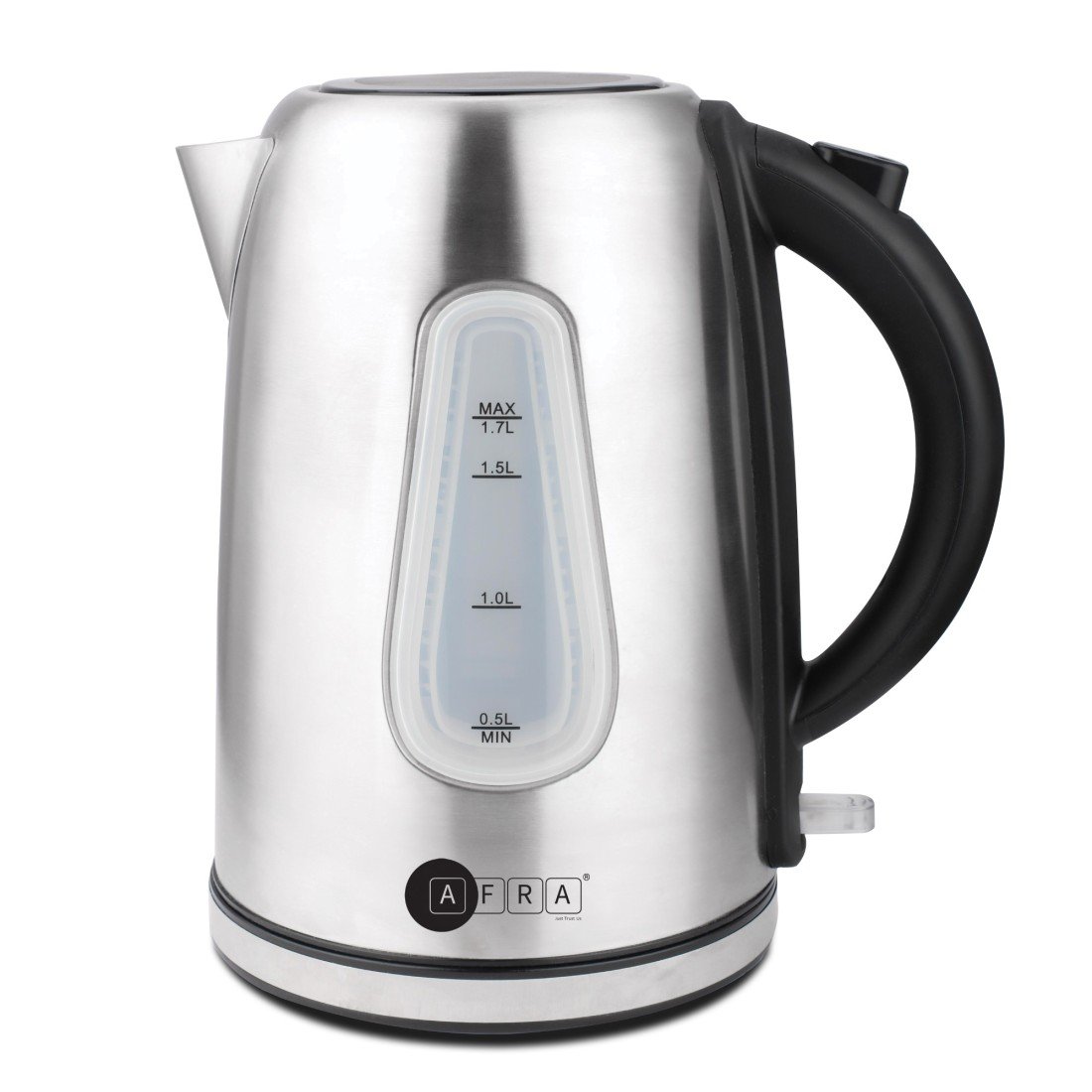 AFRA Electric Kettle – 2200W, 1.7L stainless body, auto shut-off, overheat protection, 2-year warranty.